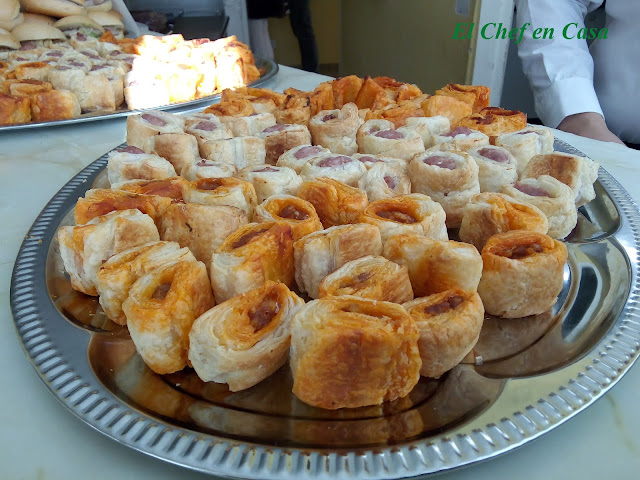 Esta vez es una nueva celebración de 50 cumpleaños para 60 comensales. Bea, su mujer, me encargo un buffet compuesto por Papas aliñás con perejil y cebolleta, Medias noches rellenas de Lomo al horno con aguacate, Saladitos de hojaldre variados (longaniza, chistorras, sobrasada con miel), Empanada casera de atún, Lagrimitas de pollo maceradas con lima,  jengibre y curry y unos Montaditos calientes de pringá casera